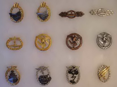 Middle row, l - r: U-boot Captain's, Driver's gold, Driver's bronze, Driver's silver. Bottom row, l - r: High Seas Fleet, Luftwaffe Panzer, Luftwaffe Ground Assault, Fallschirmjaeger.