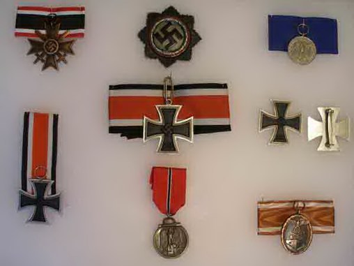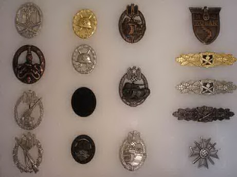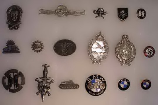 Middle row: VW large, VW small, Gestapo ID disc, WWI Pilot's Award, WWI Tanker's Award, Party Badge.